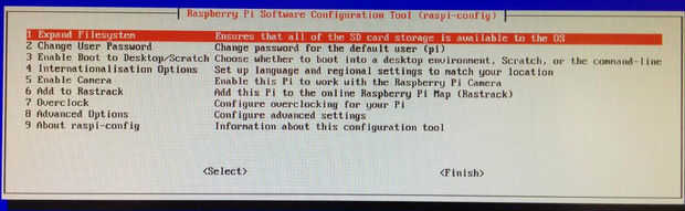 Después con éxito arrancar, tienes algunas opciones. Elegir ampliar el sistema de ficheros pulsando entrar en 1. Cambiar la contraseña de usuario 2. Pulsa finish (va con las teclas de flecha), el RaspberryPi se reiniciará y te mostrará algo que empieza a parecer una verdadera pantalla como estás acostumbrado a en un ordenador. (Muy útiles consejos para añadir Wifi a tu impresora 3D Instructable