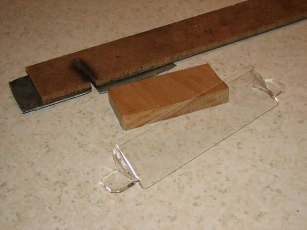 Una vez que el corte de acrílico, tendrá que doblar a la forma. Cada uno de los dos extremos tiene a doblar dos veces, para formar un trozo largo angulado con lengüetas planas en el extremo (ver fotos). Utilicé una pistola de aire caliente y un pedazo fino de madera con una muesca cortada en él para dirigir el aire caliente a lo largo de la línea que quería doblar (también he añadido algunas láminas de metal a la junta con muescas, para evitar que se quema). Asegúrese de que usted consigue el acrílico un montón caliente, debe doblar fácilmente o se romperá. Si comienza a burbujear, se está demasiado caliente y se quema. Trate de calefacción en ambos lados. Después está lo suficientemente caliente, doblar el acrílico a lo largo de la línea alrededor de una pieza cuadrada de madera, con bordes redondeados, manténgalo durante unos segundos hasta que enfríe lo suficiente como para mantener su forma. Tenga cuidado, el acrílico y la madera con muescas que tanto calentarán mucho, puedes usar guantes de cuero.