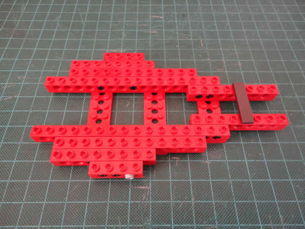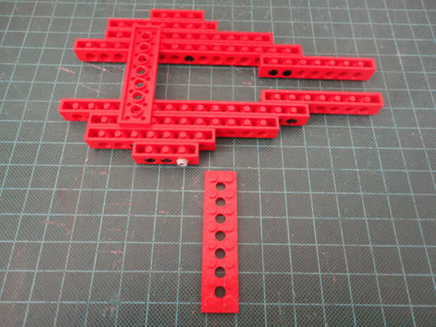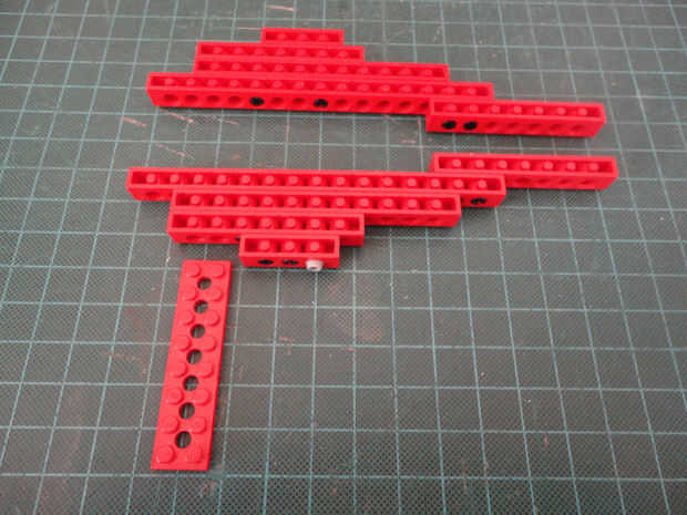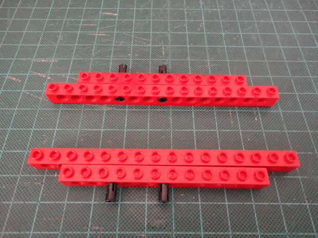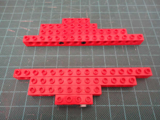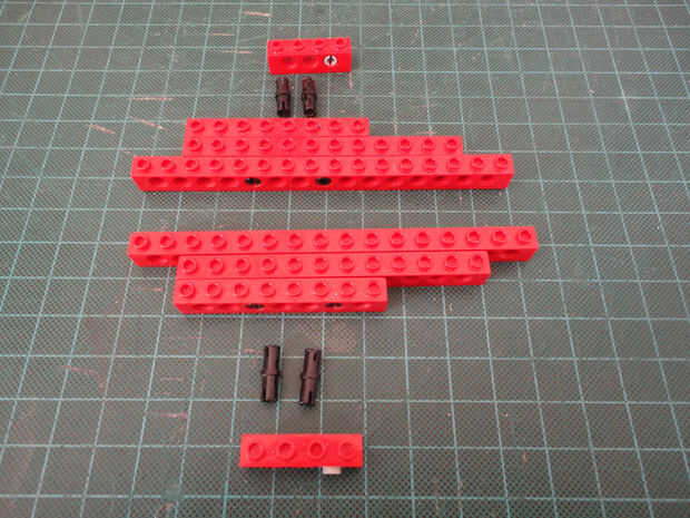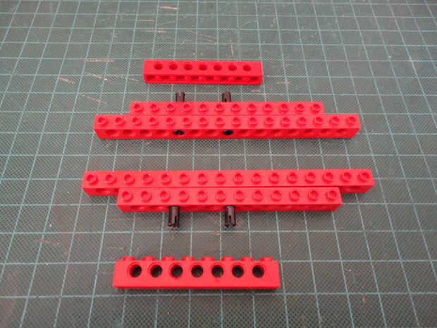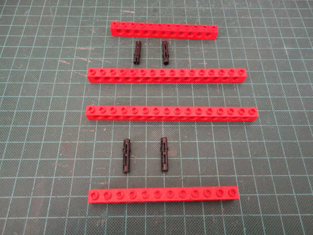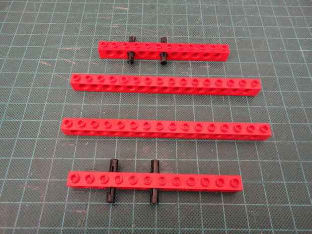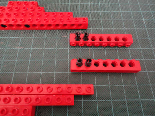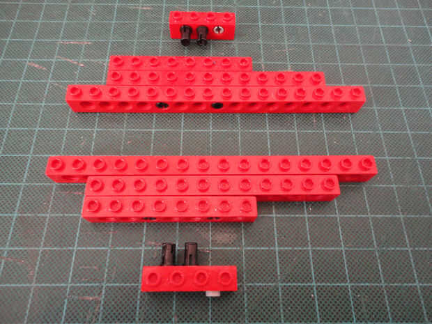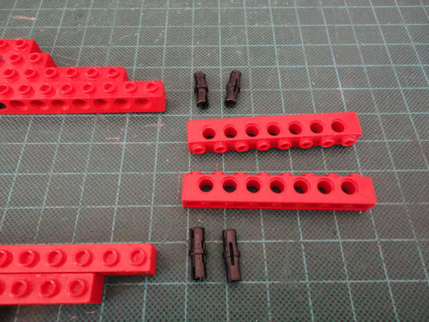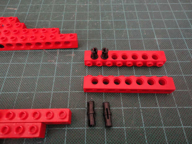 Foto 7, 8, 9, 10 Dos 1 x 4 ladrillos Technic (#3701), cuatro conector Peg (#3673) y dos de conector de clavija con la perilla (#4274)