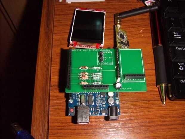 Las piezas son un clon de Arduino UNO ($5), pantalla de ILI9341 ($5), APC220 ($20) PCB ($3) y otros componentes. El modulo APC220 es caro comparado con otras opciones inalámbricas, pero tiene un largo alcance (1000m) y es confiable a través de paredes y árboles.