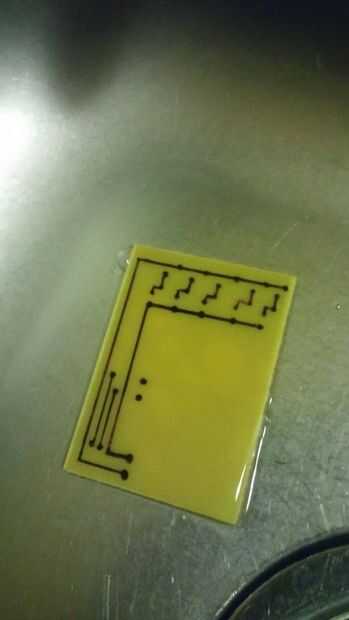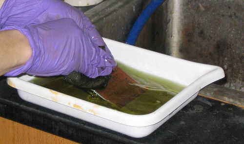 Con los guantes en un recipiente de plástico sumerja todo el tablero y moverlo hacia los lados de 1 a 2 minutos (imagen 4). Luego sacar la placa y lavar con agua fría. Usted debe tener algo como este (Foto 3):