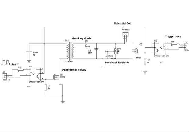 En este circuito se conecta un extremo del lado de baja con batería de 12v y el otro en el desagüe de los mosfet y la puerta del mosfet es aislado mediante optoacoplador 817. J2 es el conector del terminal 2 de donde se aplica la señal PWM y deber debe ser menos del 80% en el otro lado (lado secundario) aquí tenemos diodo shockley (su 307 o mejor de su elección) y un condensador polar 200uF de 400 voltios o usted puede aumentar su capacidad para obtener buenos resultados y asegúrese de que su voltaje debe no exceder de 250 voltios podría aumentar la capacitancia para mejor tiro la resistencia posterior alimentación es acutally una olla de 200k y el Diodo zener de 5,1 voltios está conectado a tierra para proteger a regulador de alto voltaje en que este pin está conectado con el canal analógico de regulador o cualquier otro generador de pulso a tensión de salida de rastro. Cuando llega al voltaje del deseo apague PWM en ese momento se completa el impulso conectar solenoide kicker en J1 que es disparador de optoacoplador 817 en el lado derecho pero algo que debe tener que preocuparse por su tiempo de disparo, menos me debe entonces 100ms.