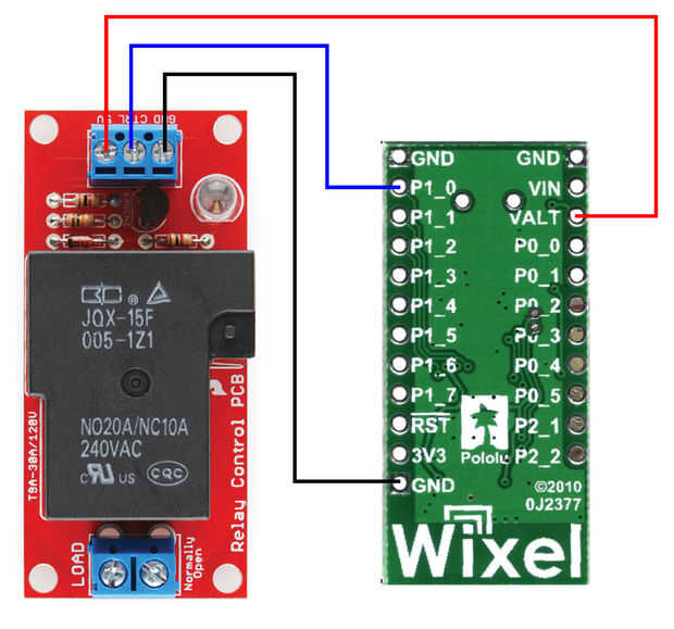 Usted tendrá que conectar su wixel a su placa de relé. Nota hay 3 cables en la placa de relé. Una es la alimentación de 5V y su tierra asociado, el otro es para el control. Necesita alimentación de 5V para el relé para controlar el mecanismo mecánico del relé y el LED a bordo. Si están alimentando su wixel con un cargador del USB 5V (como soy!), entonces usted será capaz a 5V de la fuente del perno wixel VALT. Conectar a 5V, conecte su favorito a tierra y luego conecte uno de los GPIOs Wixel a CTRL (estoy usando P1_0).