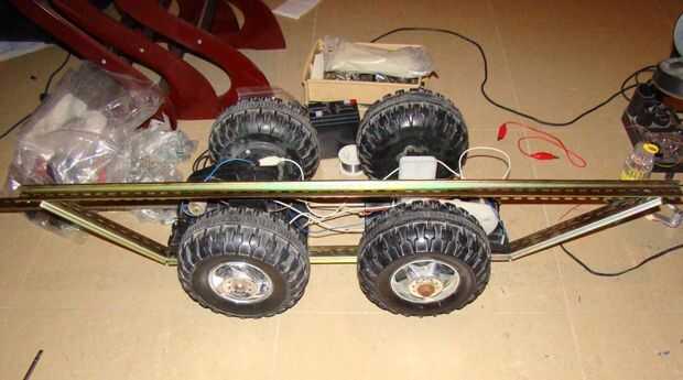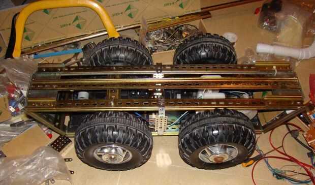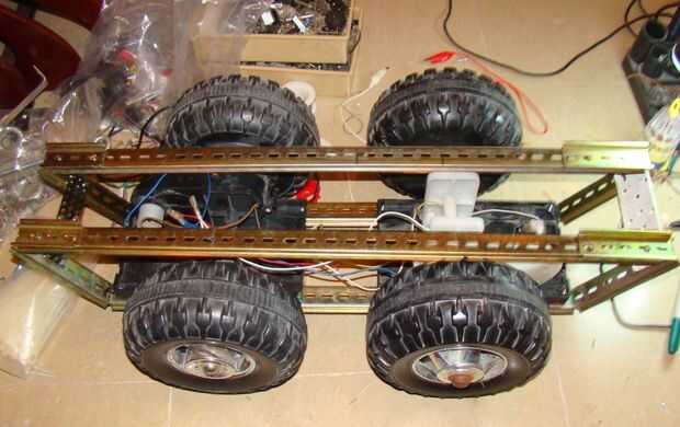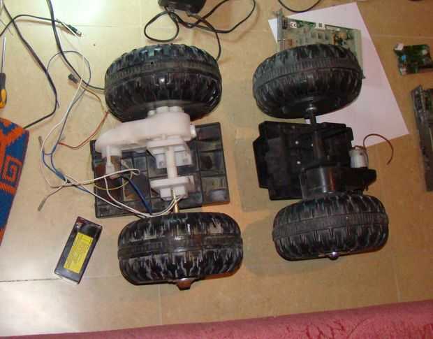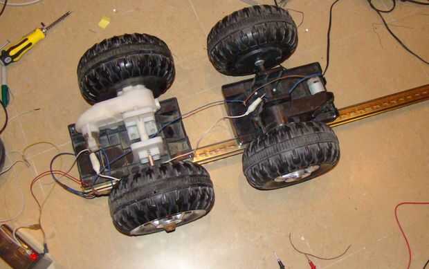 Obtener los motores, caja de engranajes y ruedas de dos coches rotos los niños juguetes del mercado de chatarra cercano, me costaron unos 10$ y me conecte usando riel din y plástico como se muestra en las fotos.