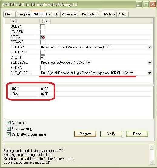 El fusible bit para resonador de 16 Mhz frecuencia externa debe establecerse en: alta: 0xC9, bajo: 0xFF como se muestra en la imagen adjunta.