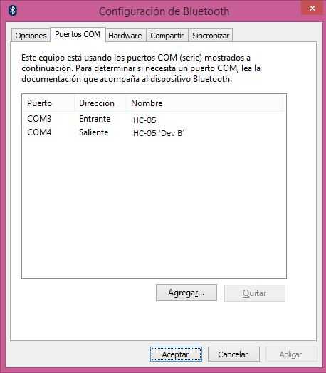 - Abra la ventana Configuración de bluetooth en el Pc, seleccione la pestaña (puertos com) y busca el número de puerto de salida. (Este número se le asignará al puerto serial del programa en visual basic)