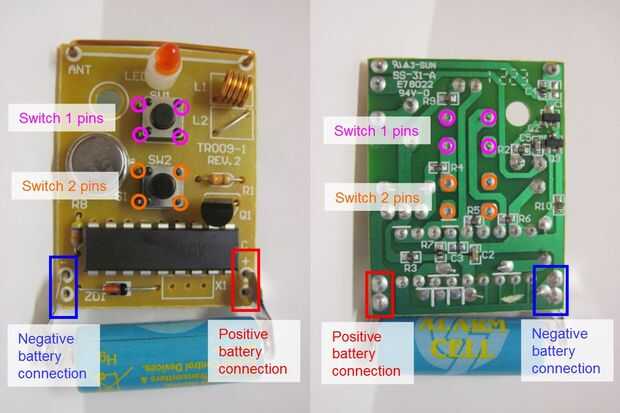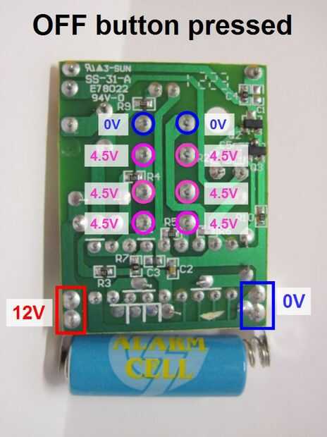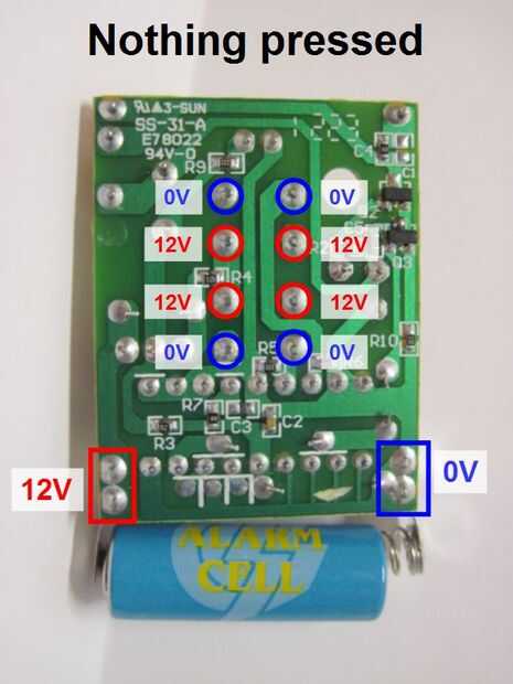 ¿Por lo tanto, lo que ocurre cuando miramos la placa de circuito? Las dos primeras imágenes, mostrando fotos al lado de ambos lados de la Junta, dan una idea aproximada de las cosas que nos importan. Hay una batería, que cuenta con terminales positivo y negativo, conectados a la tarjeta. Hay dos interruptores de botón, con SW1 y SW2 en la tarjeta de circuito, correspondientes a los botones de encendido y apagado de la caja exterior de plástico, respectivamente. Cada uno de estos interruptores tiene cuatro pines conectados a la placa, en la segunda imagen de arriba. Por lo tanto, queremos saber qué hacen estos botones - una buena manera de empezar es averiguar cuáles son los voltajes en los pines cuando se empujan los botones.