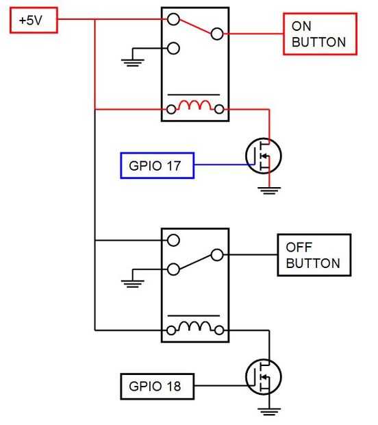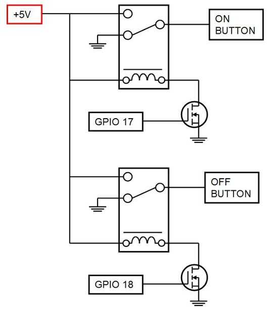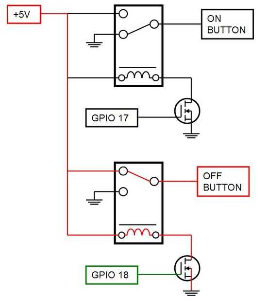 Los tres diagramas anteriores indican lo que sucede dependiendo de cual GPIO pins se establecen en alta en Python (que vamos a llegar al siguientes). Cuando ambos pasadores están sentados en el bajo, ambos relés conectan los botones del mando a distancia a 0V (tierra), por lo que no pasa nada. Cuando GPIO 17 está establecido en alto, el primer MOSFET se enciende, que permite corriente fluya a través del electroimán en el primer relais, el interruptor y conectarlo a 5V en vez de 0V. Esto envía una señal de 5V al pin del botón de encendido del mando a distancia, hacer el control remoto creo que el botón ha sido presionada. El mismo concepto se aplica a 18 GPIO y el botón de apagado.