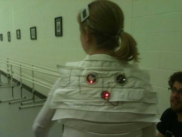 crear un traje de vestir que puede transmitir datos sin hilos puede ser un divertido y útil, especialmente para actuaciones de danza. Un equipo de nosotros crea una camiseta de danza que medidas de posición (doble sensor) del brazo y fuerza en la muñeca (sensor de presión).