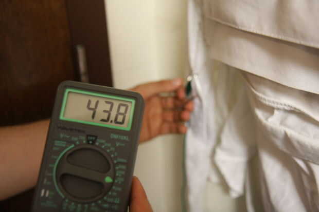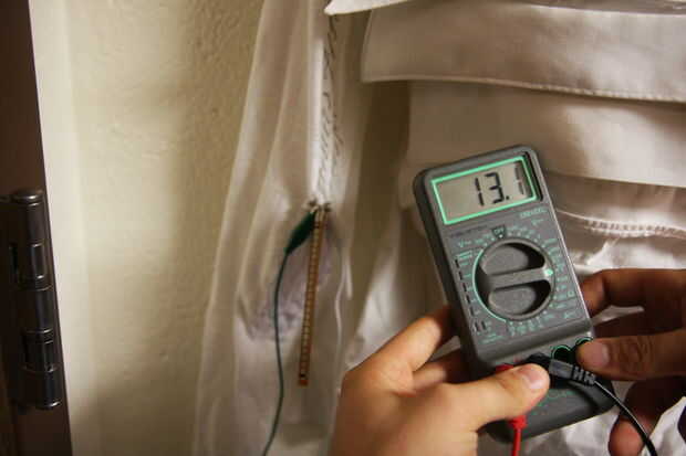 Medir el sensor de curva en posición flexionada y no flexionadas.  Medimos 13,1 K al estar acostado y 43,8 K cuando doblado.  (Probablemente usted debe hacer antes de coser en el sensor)