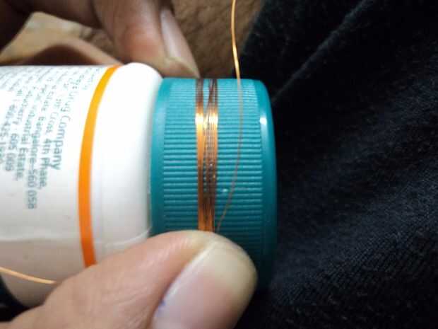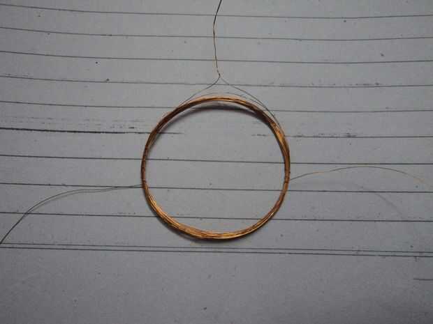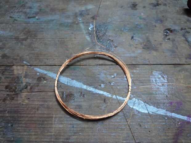 Con el mismo objeto redondo, empezar a enrollar otra vez. Esta vez cuando usted hace su vuelta 15 con el cable, crear un grifo y dejar un hilo de 3 pulgadas y luego otra bobina 15 vueltas. Ahora tienes una bobina con dos extremos y un grifo. Atar nudos en los extremos de los alambres, para que no desenrolle por sí mismo.