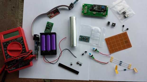 El extremo remoto contiene la celda de carga (0 a 1 Kg), el amplificador, un ATtiny85 y esclavo transmisor/receptor Bluetooth HM-10 bajo consumo de energía. El módulo de la pantalla contiene: línea 2 x 16 LCD, HM-10 configurado como master, software de bloqueo de encendido/apagado interruptor, botones, interruptores, Banco de baterías USB y un regulador micro de Arduino Pro Mini 8 Mhz 3.3 voltios.
