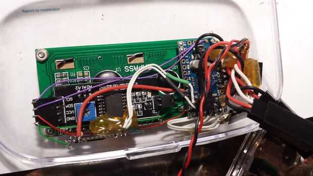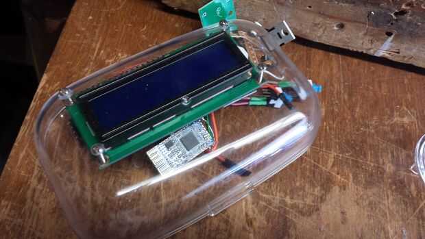 Coloque el HM-10 construido en antena del espaciador hacia la parte delantera de la caja, clara de metal o de cables y en una posición tal que puede verse el modo HM-10 led. Asegurar con pegamento caliente a la pantalla lcd.