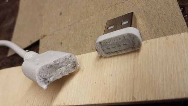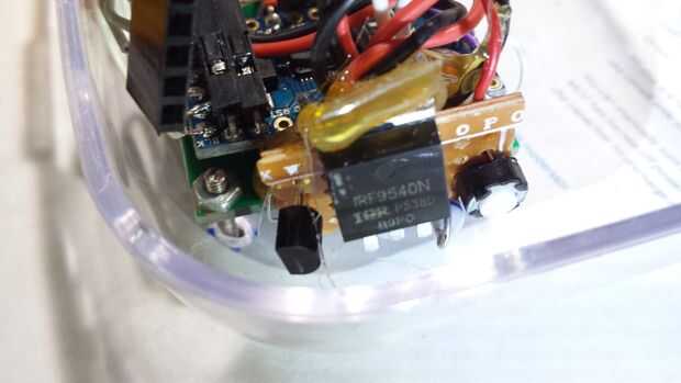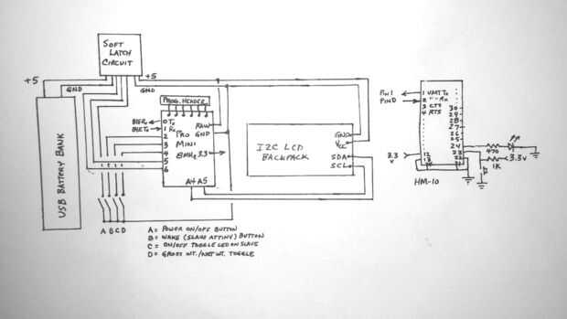 Desde la fuente de alimentación necesaria para el lcd con 5 voltios de alimentación, pero el HM-10 necesita 3,3 voltios, un Mini Pro con un regulador de 3.3 voltios a bordo fue elegido. Que simplificado nivel lógica interconexión entre el Mini Pro y el HM-10 e incluso a la mochila de I2C (componentes de I2C 5V pueden ser conectados a las líneas SDA y SCL de los 3.3V Mini Pro I2C-bus), mientras que todavía da el lcd 5 voltios para una visualización normal. Un banco de baterías USB común fue elegido para proporcionar 5 voltios porque es fácilmente recargable vía USB, encaja bien en el cuadro de proyecto (Jabonera) y vino un color agradable para mostrar a través del caso del plato de jabón transparente. Porque el espacio longitudinal es limitado en la jabonera, un conector USB fue reducido y alambres soldadas al corte conector (exteriores 2 pins) y extendido a la entrada de la energía de la placa de circuito de Softlatch.