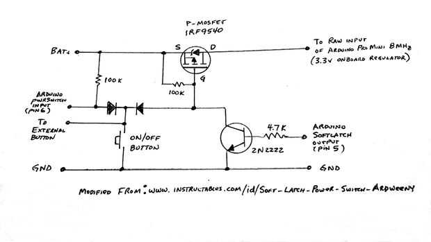 Pegamento caliente el Arduino Mini Pro a un pedacito de palito y pegamento caliente el palito para la pantalla para guardar el Mini Pro por encima de las pestañas en la pantalla lcd. Construir el Softlatch circuito de encendido-apagado en un pedazo de perfboard según el diagrama del circuito-crédito a Ardweeny y cable a tierra y Raw entrada del Mini Pro y control de líneas a los pines 5 y 6 del Mini Pro. El encendido/apagado principal botón de alambre y tierra a un botón montado caso. Pegamento caliente del circuito de Softlatch a la pantalla lcd.
