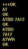 Tipo 'a' seguida por y recibe 'OK' para confirmar que estás en modo de programación. Modo de programación termina después de un período de inactividad - puede enviar ' +++' para volver a él. Todos los comandos de programación siguen. Enviar 'ATBD 7A12' y obtenga 'OK' para establecer la velocidad en baudios (7A12 en hex = 31250), enviar 'ATBD' obtener '7A12' para confirmar el valor correcto y enviar 'ATWR' y obtenga 'OK' para escribir el valor en el XBee. El intercambio entero debería verse algo como la imagen. Lo mismo para ambos radios XBee.