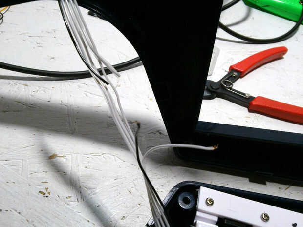 Puedes ver qué líneas de + 3.3V (VDD1) y GND mediante la lectura de la serigrafía (ver imagen). Utilice un cúter cortar sobre una longitud de 6cm de estos dos de la cinta plástica de unirse a los cinco hilos de corriente para el sensor de contacto PCB. Luego cortar en el centro y tira de los extremos libres. Deslice un poco de encogimiento de calor en uno de los cables, luego soldar un nuevo cable a cada par de cables que corta. Deslice el encogimiento del calor en los cables pelados y encogimiento hacia abajo para guardar cosas de cortocircuito.