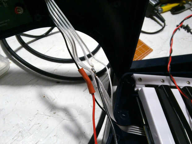 Ahora para el puerto de MIDI. Soldar un par de cables a los pines 4 y 5 (los pasadores a ambos lados del perno central, ver imagen). Los cables deben ser lo suficientemente largos para llegar a alrededor de la parte superior de la keybed y hacia donde va el circuito de XBee/MIDI IN a sentarse justo al lado del sensor de contacto. Te recomiendo un montón de soldadura y un hierro caliente para obtener una buena adherencia y luego asegurar los dos cables a la placa justo detrás del puerto con un poco de cinta de electricista, para reducir la tensión en la soldadura las juntas y mantenerlas de palomitas gratis.