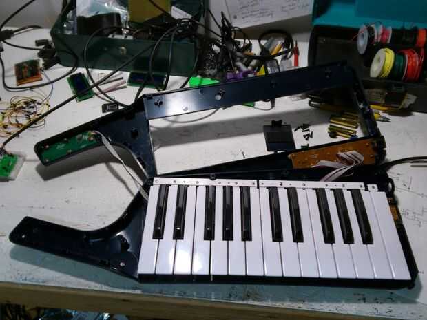 El plan es construir un circuito de entrada MIDI como se describe en la especificación MIDI, alambre un XBee hasta su salida, pegarlo dentro de la keytar y pase los cables desde el parte trasera del puerto de la keytar MIDI OUT a la entrada de nuestro circuito de entrada MIDI. En este paso nos abren el keytar y empalme en algunos cables de la conveniente y soldar los cables en la parte posterior del puerto MIDI.