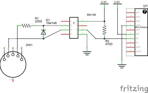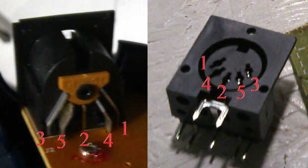 Golpear juntos el circuito que se muestra en el esquema en su perfboard. Siempre tengo un loco momento difícil mantener las terminales MIDI puertos recta, ya que dependen de si buscas en la parte delantera o trasera del puerto, y las cosas son freaking simétrica. Si compartes mis problemas se refieren a la imagen provechoso numerada.