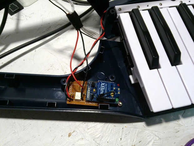 Una vez tienes todo con cable potencia de hasta el puerto de MIDI pero antes de que se atornille la cosa detrás, encienda el keytar. El LED verde en el XBee debe empezar a parpadear si tienes poder. Los indicadores en el frente de la keytar parpadeará unas cuantas veces, luego uno se iluminará constantemente para indicar que un dispositivo es conectado al puerto MIDI, que ahora será siempre el caso. Si los indicadores mantienen parpadeando, hay un oops en tu circuito. Usted puede también poder hasta el otro XBee (enchufar en un puerto USB con el cable FTDI funcionaría) para asegurarse de que tienes tanto programación correctamente. El rojo en ambos XBees deberá encenderse como los datos de sentido de midi de la keytar es enviado entre dos XBees.