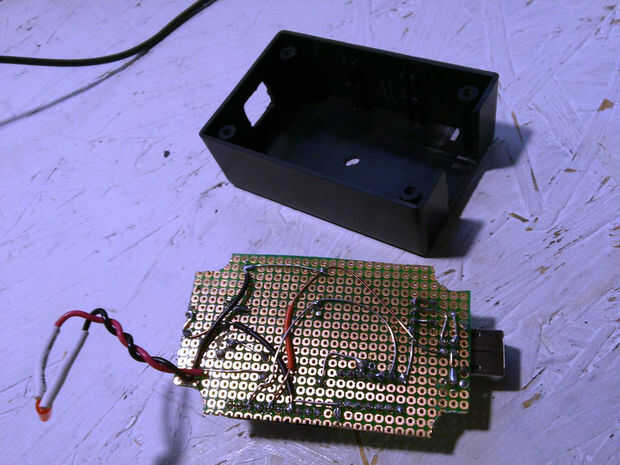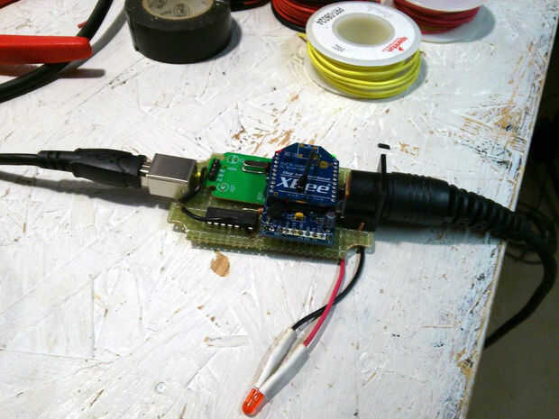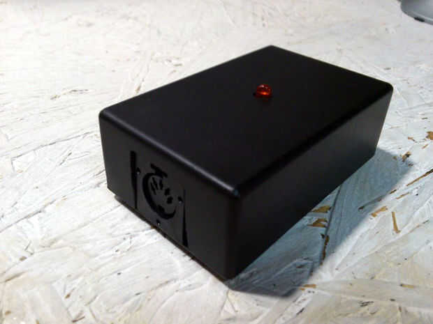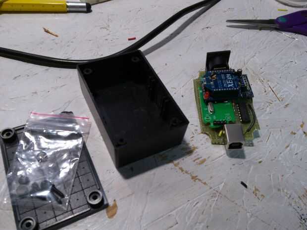 Construir el circuito que se muestra en el esquema de perfboard. Otra vez, el tamaño de la placa para que encaje perfectamente en el cuadro de. Como se puede ver en las imágenes, tenía que tener los XBee se sientan en la parte superior el cable MIDI barato PCB para obtener cosas para encajar en la caja. Usé algunos cinta aislante en la parte inferior del adaptador XBee para asegurarse de que nada en corto. El arreglo requiere de componentes hecho mi cableado debajo de la mesa directiva en un poco de un trabajo del destral, pero perfboard no tiene que ser bonito. Coloque el LED con los cables del vuelo por lo que se puede colocar sobresalga de la parte superior de la caja. Corte agujeros en la caja para lo puertos/LED (una herramienta giratoria es muy útil para esto) y montar todo. Me pareció que dimensionando la Junta de ajuste apretado en el cuadro, hay suficiente apoyo que enchufar cables no moverse el proto board o tensión de los empalmes de la soldadura para los puertos. Los componentes calcen bien bastante que otra vez no veo la necesidad de asegurar con pegamento caliente o separadores.
