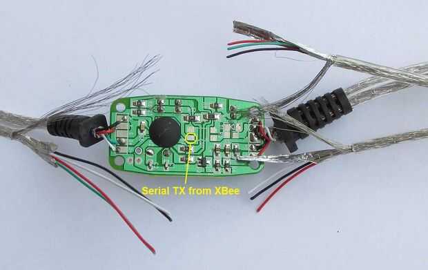 Crack abre el cable MIDI USB barato y revisa la tarjeta de circuitos dentro. Encontrar el contorno de la serigrafía en la que debería ser el optoacoplador y las almohadillas donde se suelda el cable USB en. Debe haber serigrafía indicando que son 5V (rojo), GND (negro) datos + (verde) y datos-(blanco). Deberá confiar en los colores de los cables si no existe. Datos MIDI serie (TX de lo XBee) deben ir en el cojín situado donde debe ser el pin 4 del optoacoplador - he circundado en amarillo en las imágenes. Las pastillas en mi fueron bastante grandes que podía perforar agujeros en la PCB y pins de cabecera en lugar de la soldadura. Esto hizo más fácil caber en perfboard, pero podría no funcionar si el tuyo es fabricado diferentemente, en cuyo caso los cables directamente en los cojines de la soldadura.