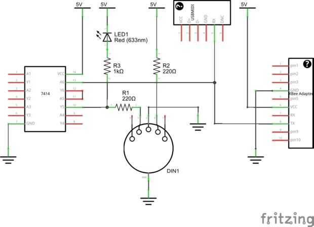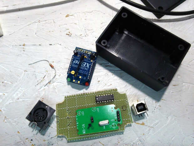 Ahora construiremos una pequeña caja de la vivienda el otro XBee, un circuito de salida MIDI y una interfaz USB que te aprovechables de un cable de interfaz USB-MIDI barato. Podemos conectarlo a un ordenador mediante el puerto USB y reproducir sonidos en una DAW, o energía con un adaptador de 5V y conecte un módulo de sonido o sintetizador/sampler en el puerto de MIDI.