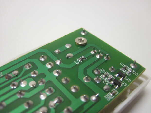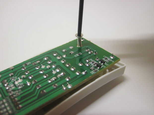 Esto expone la parte inferior de la placa, que puede quitar de la caja a echarle un vistazo a la parte superior de la mitad. Sin embargo, me resulta más fácil trabajar con la placa de circuito a la mitad delantera de la caja. Esta manera, usted puede fácilmente empujar los botones cuando usted está probando el circuito (siguiente paso). La batería también tiende a permanecer en el mejor cuando es en el caso. Había un agujero sin ocupar en caso de que con un agujero en la placa de circuito - usé el pequeño tornillo para sujetar la placa de circuito a la mitad delantera de la caja (ver las dos fotos de arriba).