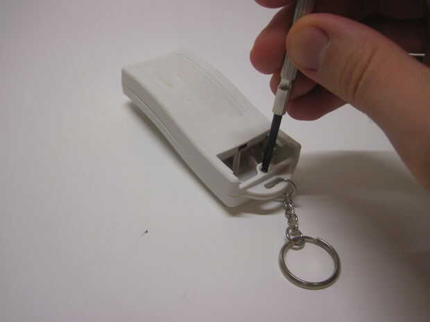 2. Utilice un destornillador de cabeza Phillips para quitar el tornillo solo que sostiene la parte delantera y unirlas a mitades de la caja de plástico.