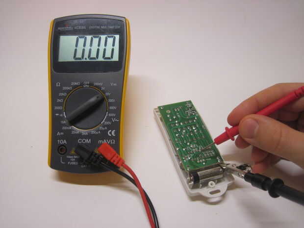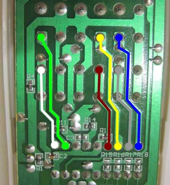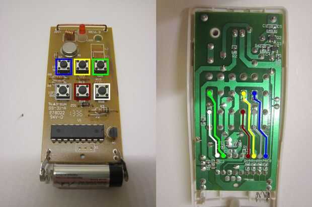 Hay dos formas complementarias de hacerlo. Uno es mirar las huellas en la parte posterior de la placa de circuito, figura cuáles conectar los botones a los pines en el chip. También puede comprobarlo con un polímetro comprobando para ver que pin cambia de 0V a 5V al pulsar cada botón (Asegúrese de que la batería está en, o que no funciona!). Este último puede ser un poco difícil hacerlo con las dos manos y es definitivamente más fácil si tienes los accesorios clip de cocodrilo para el multímetro.