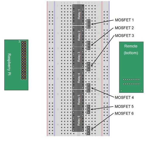1. Inserte los relés y los MOSFETS (seis de cada uno). Importante : no me di cuenta hasta después de todos estos diagramas que el embalaje de los relés es ligeramente demasiado voluminosos que ocupan filas adyacentes del tablero, como en la foto. Realmente necesita una fila en blanco entre cada relé, añadiendo cinco filas de espacio total para la construcción (que no debería ser un problema si ya estás usando un protoboard 60 + fila grande).