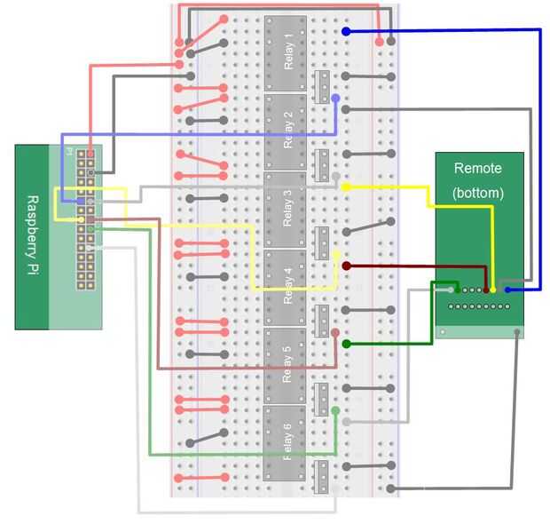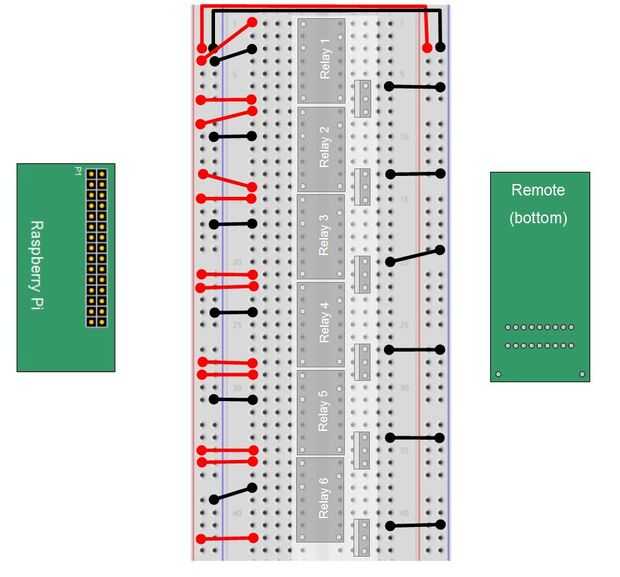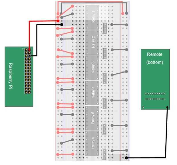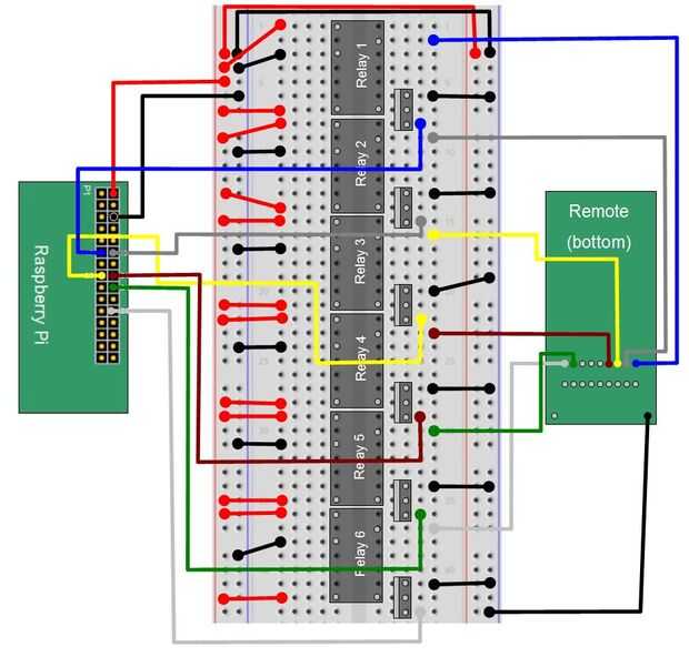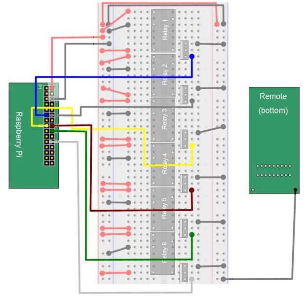 5. Conecte los cables que usted previamente soldadas en el remoto a la protoboard. Usar la misma Convención de señalización para estos cables en los diagramas anteriores.