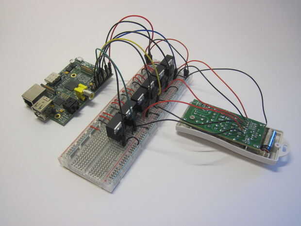 3. Conecte la placa a los pines de frambuesa Pi + 5V y GND y el negativo de la batería terminal (-) del mando a distancia. Importante: no Conecte el riel de alimentación positiva en la placa (+) terminal del mando a distancia de la batería. La batería remota es de 12 voltios, así que si usted corta que al pin de 5V de la Raspberry Pi, le suceden cosas malas.