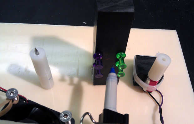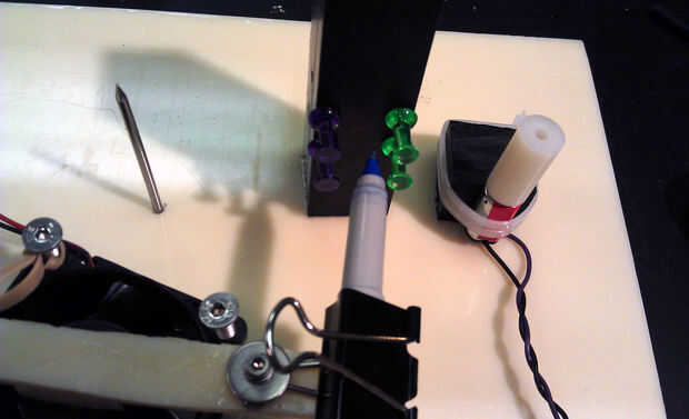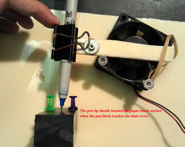 Utilizan súper pegamento en cola el bloque de papel en la placa base. Ajuste la posición del bloque de papel. Cuando el bloque de lápiz golpea el tornillo del límite, la punta del lápiz debe toca la superficie del bloque de papel. También puede ajustar la posición de la pluma en el clip de papel. (imagen 27 y 28)