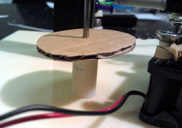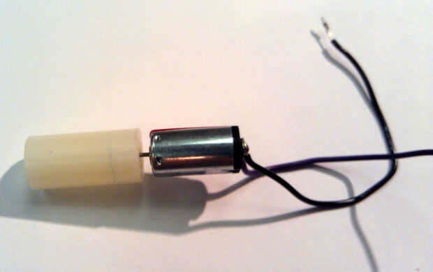 Conectar a un espaciador con un pequeño motor. Monte el motor sobre un pequeño trozo de bloques (bloque motor). Ajuste la altura del motor para que la punta del lápiz y el punto medio del espaciador en el motor están en el mismo nivel. Use super pegamento para pegamento del bloque motor al lado del bloque de papel en placa base. (imagen 29 y 30)