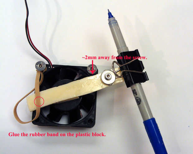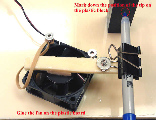 Use pegamento para adherir los bloques (bloque de pluma) en el ventilador. El bloque debe ser aproximadamente 2mm del tornillo. Use pegamento para adherir la goma en el borde del bloque de la pluma. Inserte un rotulador en el clip de papel. Cuando aplicamos tensión al ventilador, se gire hacia la izquierda y avanzar el rotulador hasta el bloque de plástico golpea el tornillo. Cuando el ventilador está apagado, la goma se tire el bloque de plástico a su posición original. (cuadro 23)