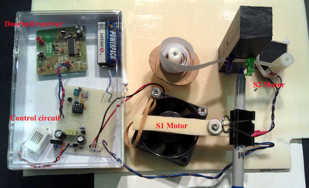 Ponga el rollo de papel en el clavo. Introduzca con cuidado la tira de papel aunque las clavijas de empuje. Usar cinta scotch para cinta de la tira en el espaciador motor. Ahora que termine todas las partes mecánicas. (imagen 35)