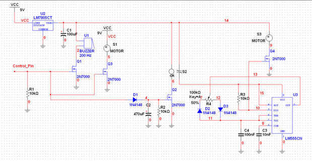 Aquí uso 9V fuente de alimentación para el sistema entero. U2 y C1 cambio de 9V a 5V. Cuando el pin de control es alto (el transmisor está encendido), Q1 se activa el zumbador para hacer sonar el sonido. Al mismo tiempo, Q3 activa S1 motor (el motor de 12VDC) para empujar el rotulador para dibujar puntos y líneas en la tira de papel.