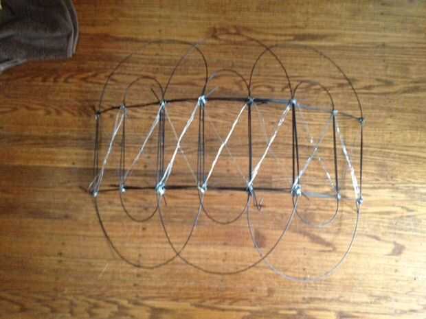 he encontrado un trozo rectangular de madera contrachapada en un vecino basurero donde un apartamento había sido renovado así como marcos de jardín alambre de frontera. Divide los marcos de alambre por sus bisagras y colocados uno encima del otro frente a frente las direcciones para proporcionar apoyo. Tomé tres secciones y les conectarse juntas y girar el alambre adicional de la artesanía para formar las formas X apoyar las bombillas incandescentes.