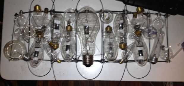 Ponerse en contacto con diseñadores de iluminación local, showrooms y tiendas de artesanía reciclada que compilé algunos docena bulbos que van desde 750 watts a 20 vatios, teniendo todas diferentes formas y tamaños, destacando el filamento y formas intrincadas colocándolos al azar en todo el marco para dar un diseño caprichoso. Para adherir las bombillas utilicé arte alambre y pegamento caliente.