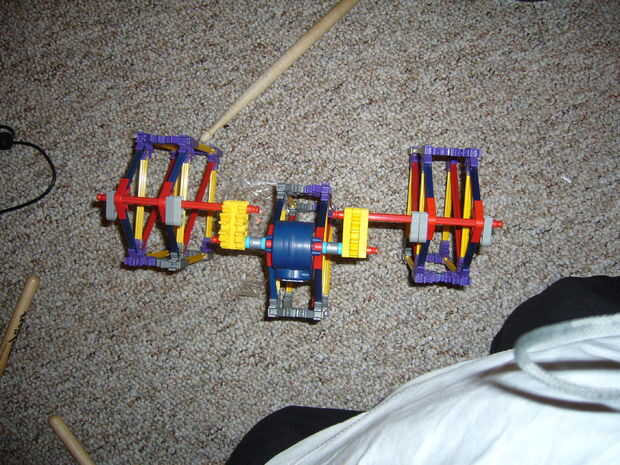 , Poner todo junto. Conecte el conector rojo cositas sobre la cosa cuyo nombre es desconocido para las barras azules en las piernas. Gire a la izquierda para obtener mejores resultados. (Debido a la manera el motor no es equilibrado. Usted puede colocar el camino que lo tengo, o se puede poner por lo que se enfrenta el logo K'NEX en el motor. Trabaja ambas maneras.