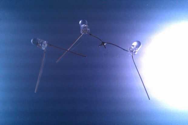 Primero soldar el LED en serie. Usé 3 LEDs de 5mm que tienen una tensión de aproximadamente 3, 2V, por lo que en este proyecto no utilizar una resistencia con la batería de 9v. Soldar los LEDs para que el positivo (la pata más larga) de una va al negativo (pierna más corta) de la siguiente. A continuación, soldar el cable de clip de negativo de la batería hasta el final positivo de su fin de LEDs.