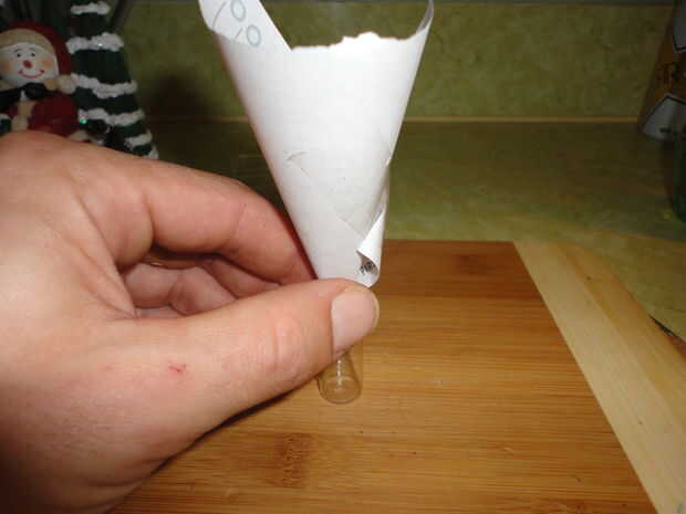 Ahora hacer un pequeño papel del embudo y verter una pequeña cantidad de granos en cada una de las dos botellas vacías, una cuarta parte del volumen debe estar bien.