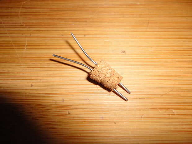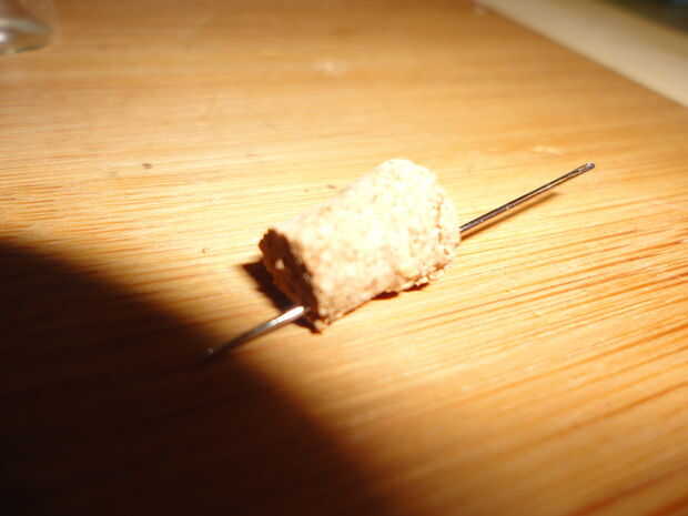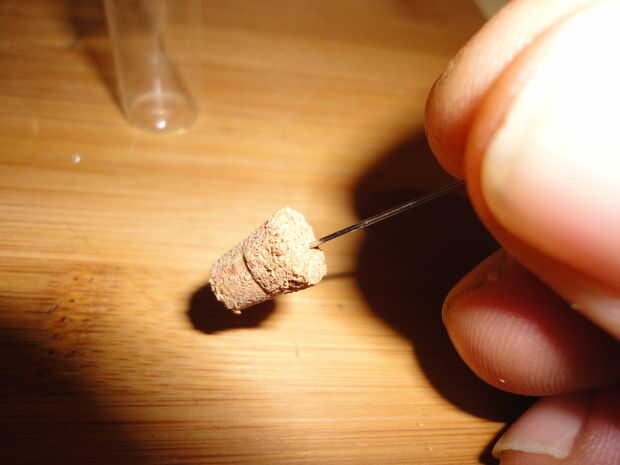 Tomar su aguja y 'perfore' dos agujeros en cada uno de corcho por cuidadosamente empuje la aguja a través del corcho, trabaja lentamente, los corchos son frágiles y quebradizas.
