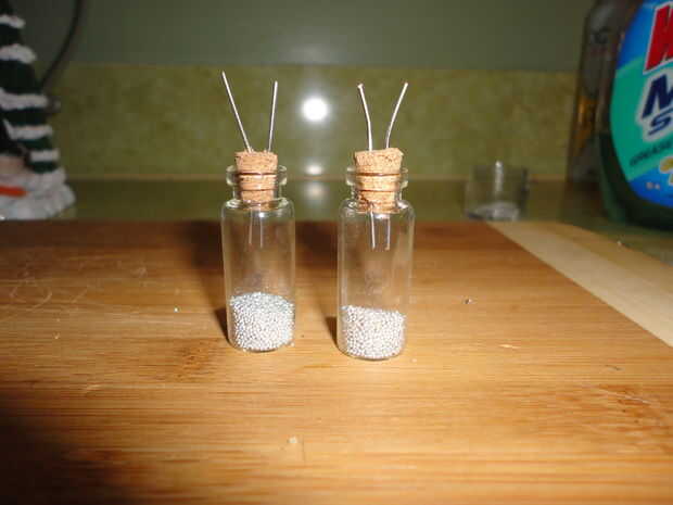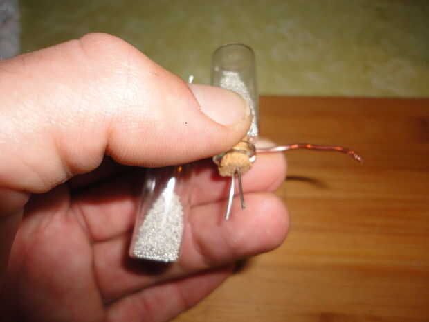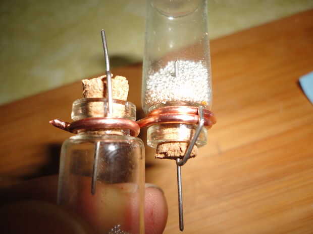 Inclinar una manera y los granos en una botella deben enterrar los contactos dentro de la botella, cerrando así el circuito por ese lado. Inclinar al revés, y los granos caen lejos de los contactos rompiendo la conexión. El efecto contrario se sucede en la otra botella.