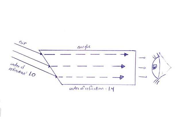 Las gafas de doblez de lado vienen de nosotros uno de los extremos cilíndricos de nuestra barra de corte en ángulo. Cuando hacemos esto, cambiamos hacen que las ondas de luz a nuestro ojo. Cuando la luz cambia medios (como el aire al plástico), los rayos que no son perpendiculares a la superficie se doblará. Es decir, del aire al plástico, doblará más cerca a la normal (un perpendicular de la línea trazada a la superficie del plástico que entra). Esto significa para nuestras gafas como yo orientado a que la luz que llega a nuestros ojos es realmente luz que vino de la derecha y doblado. Esto nos hará percibir que todas las cosas aparecen más izquierda en nuestro campo de visión de lo que realmente son. Esto hace que para que las tentativas hilarantes por el usuario hacer cosas cotidianas. Cepillado de dientes, hacer té y abriendo una puerta convierten en tareas importantes. Curiosamente, como con muchas cosas, los seres humanos pueden adaptarse.