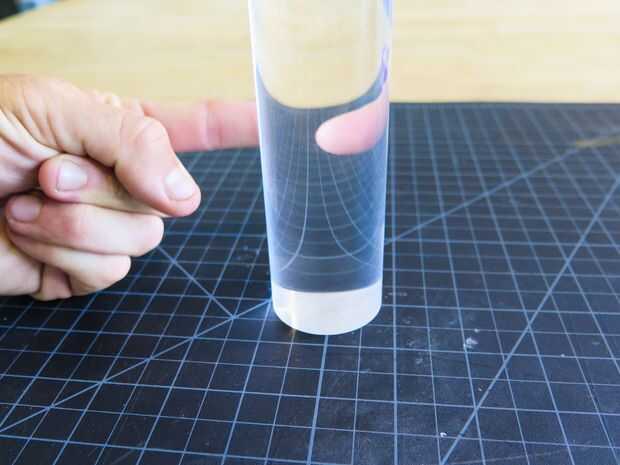 En este caso, vamos a jugar con la forma de una barra de acrílico de doble luz. Como se puede ver en solo mirando, la varilla desde el lado puede convertir líneas rectas en curvas e incluso revertir lo que los objetos secundarios parecen venir de (véase el ejemplo del dedo). Sin embargo, si miramos rectos hasta el final de un similar, el mundo sería similar a como lo hace normalmente.