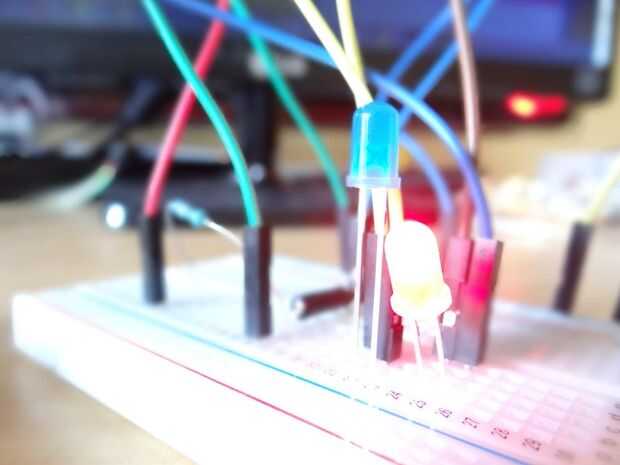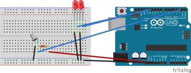 El circuito: * LED conectado desde el pin 13 a tierra * LED del pin 12 atado suelo * pulsador conectado al pin 2 de + 5V * resistencia de 10K conectado al pin 2 (interruptor) de la tierra