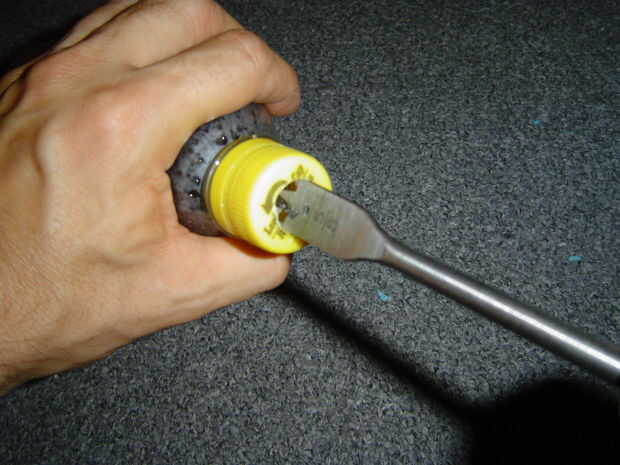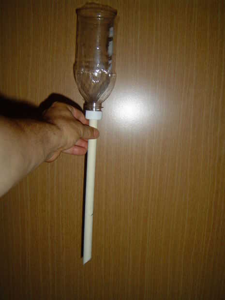 Taladro de 5/8 de pulgada en la tapa de una botella de plástico de bebidas. Usé pop botellas de 500 ml para éste. Cortar la parte inferior de la botella. Coloque la botella boca abajo en el tubo.
